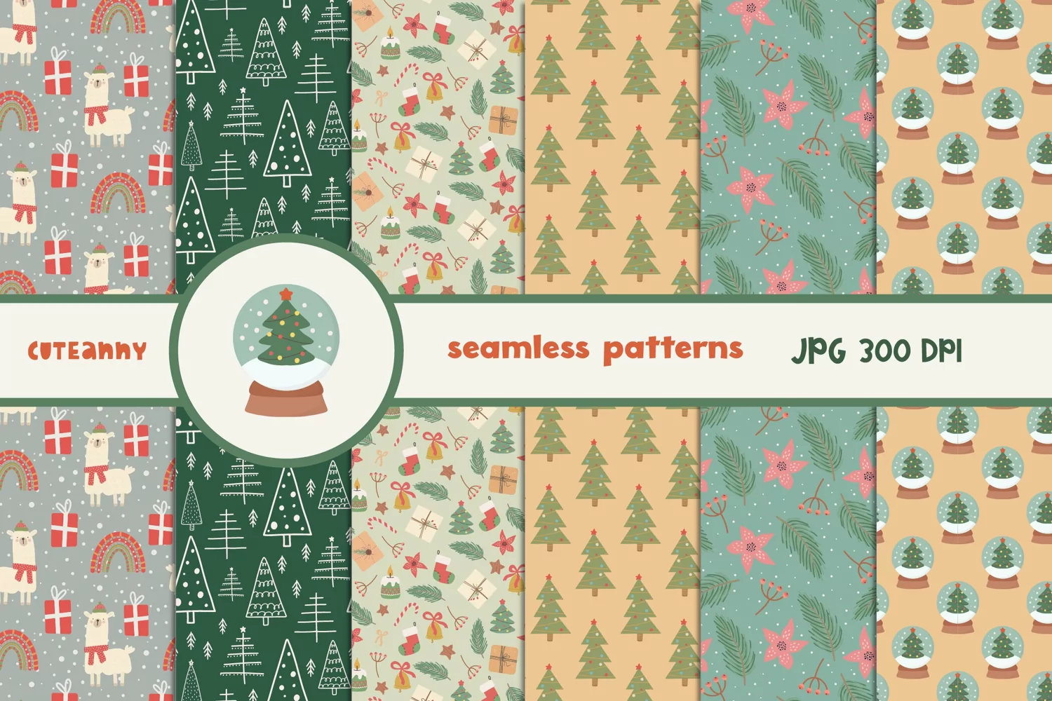 Christmas seamless patterns. Enjoy cute print with woodland animals, Christmas trees, gifts, candles, holiday mugs, stars, branches, and other magical elements. Use these cozy elements to create greeting cards, children's clothing,