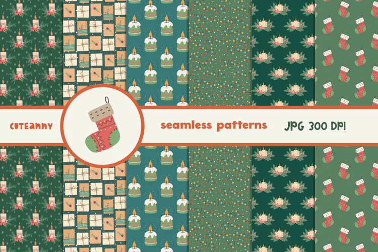 Christmas seamless patterns. Enjoy cute print with Christmas gifts, candles, holiday mugs, stars, branches, and other magical elements. Use these cozy elements to create greeting cards, children's clothing,