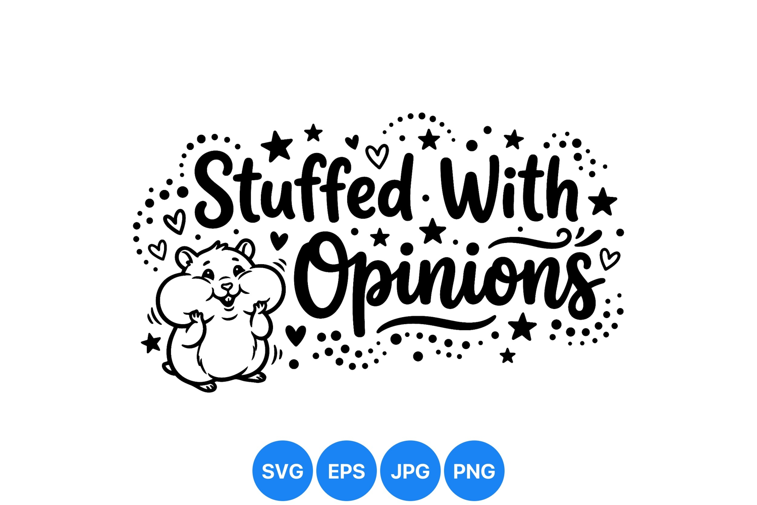 Adorable cartoon hamster with full cheeks stands smiling beside bold playful handwritten text saying stuffed with opinions decorated with stars hearts and dots lively fun vibe