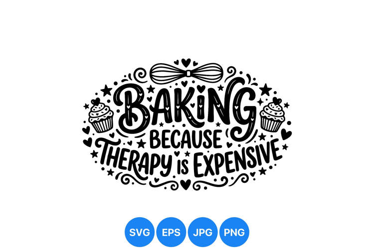 A hand drawn black and white typography design states baking because therapy is expensive surrounded by cupcake and whisk icons with decorative hearts and stars creating a playful mood