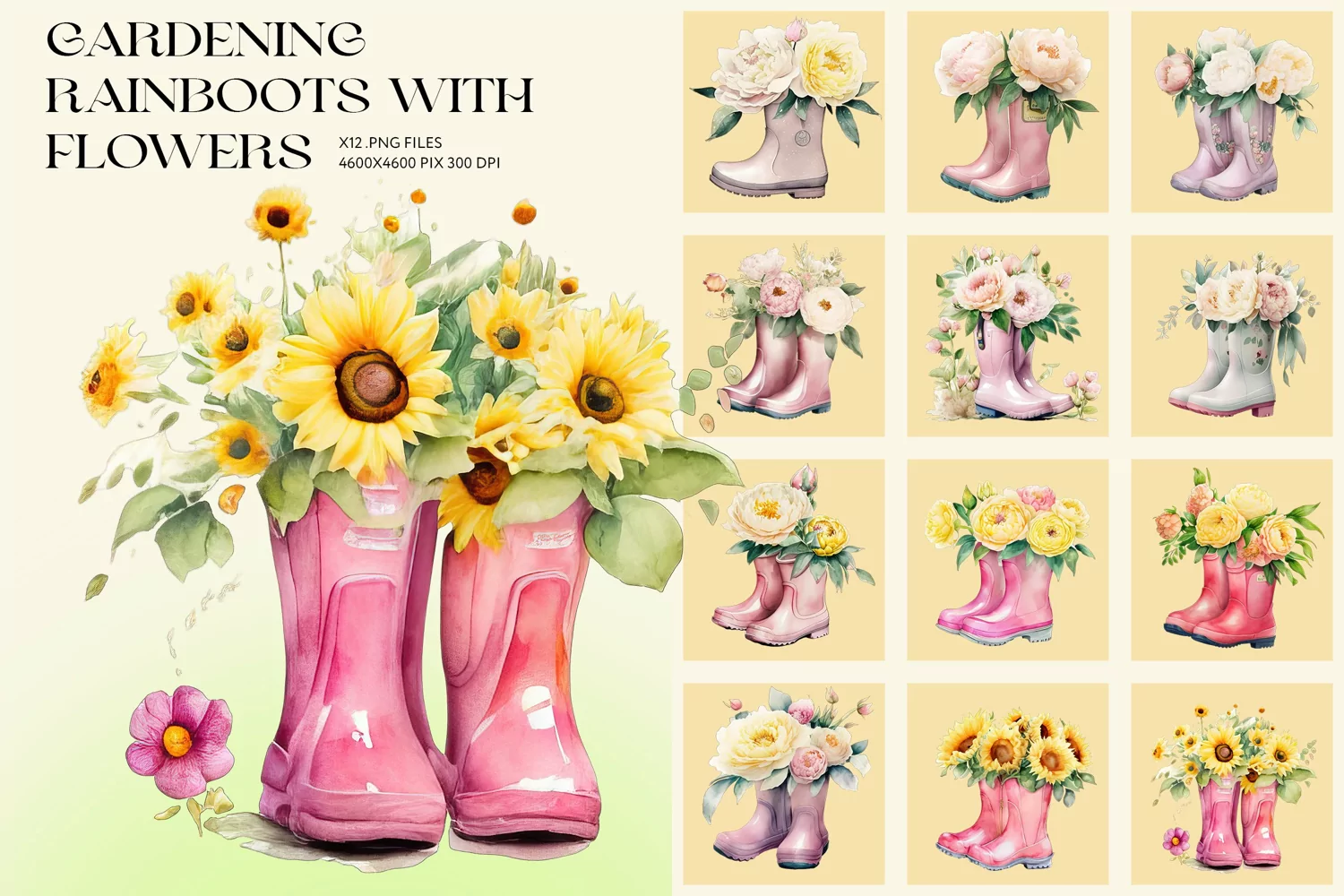 12 Rainboots with Sunflowers and Peonies - High Quality .PNG files (300 DPI)