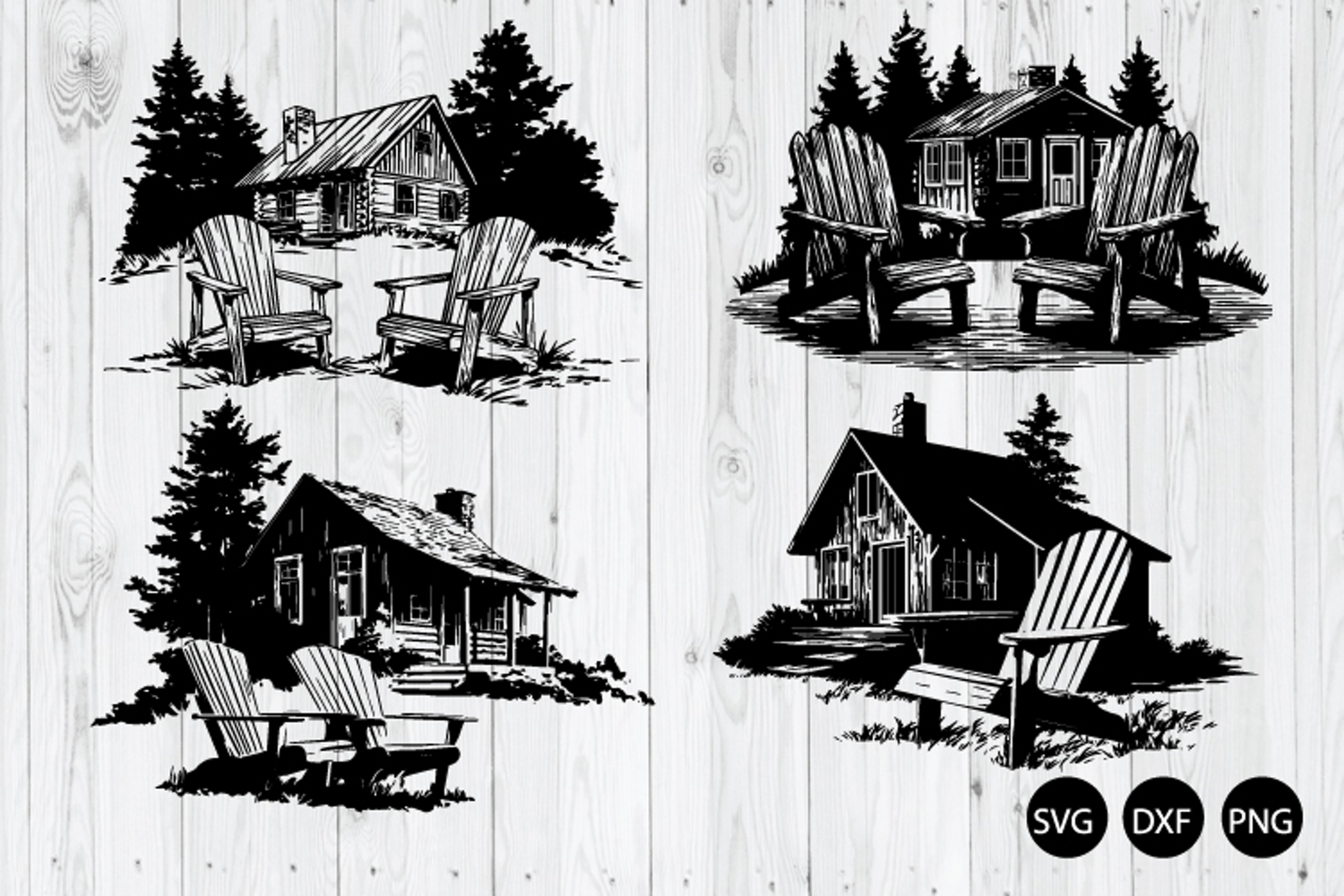 Rustic Cabin Retreat With Adirondack Chairs SVG, Chair SVG, DXF, PNG Cut Files for Silhouette Cameo or Cricut