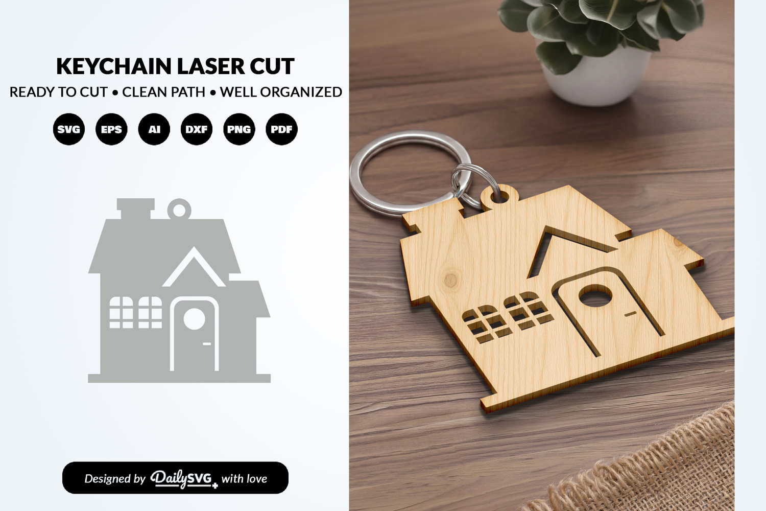 Create simple and meaningful keychains with this easy to use SVG template, specially designed for laser cutting machines. Featuring a classic house shape design, this file is perfect for housewarming gifts, home-themed accessories, or decorative projects. Optimized for clean cuts and smooth finishing.