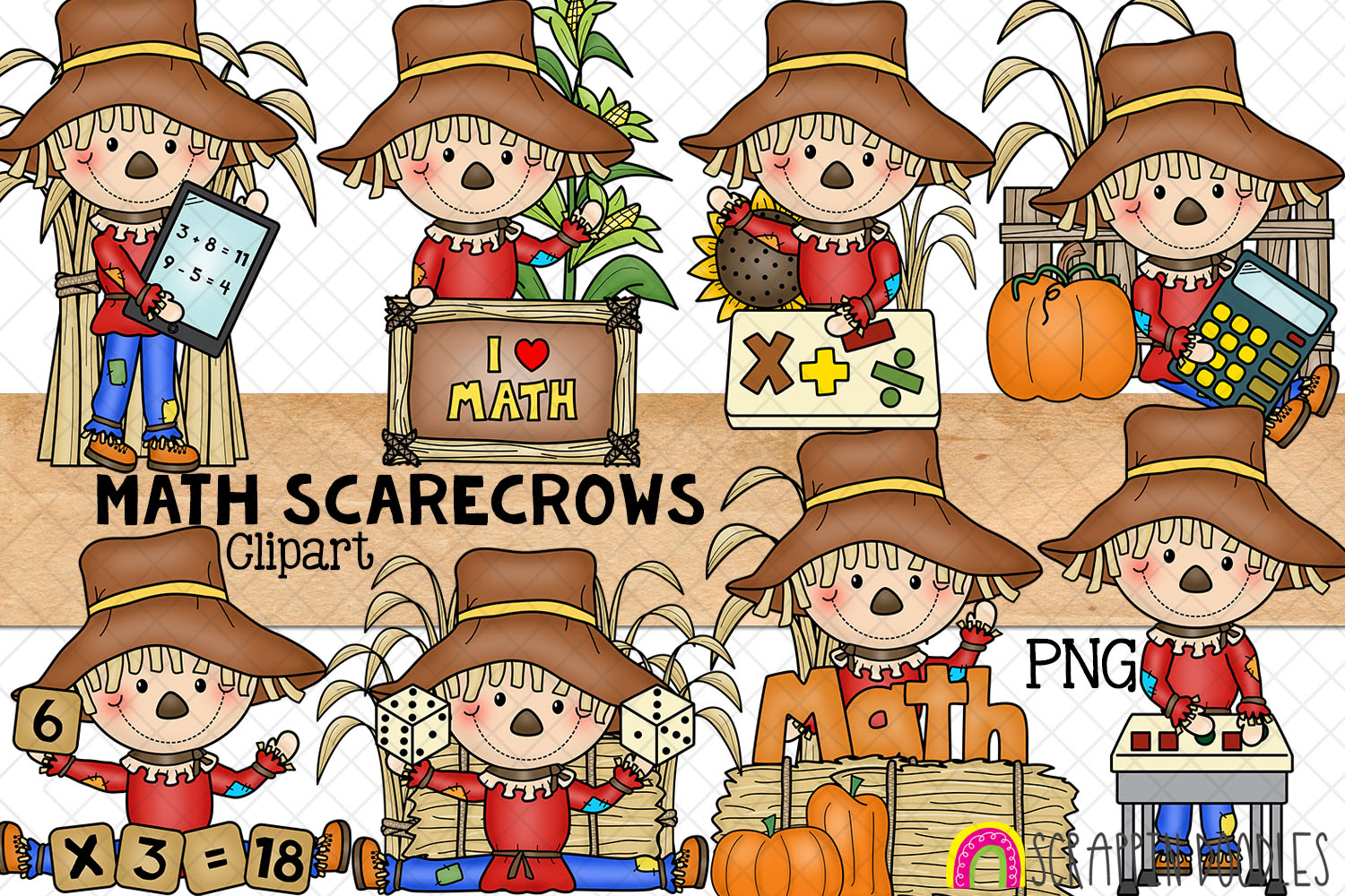 Math Scarecrows Clip Art - School - Autumn - Fall Farm - Hay Bales - Pumpkins - PNG Sublimation