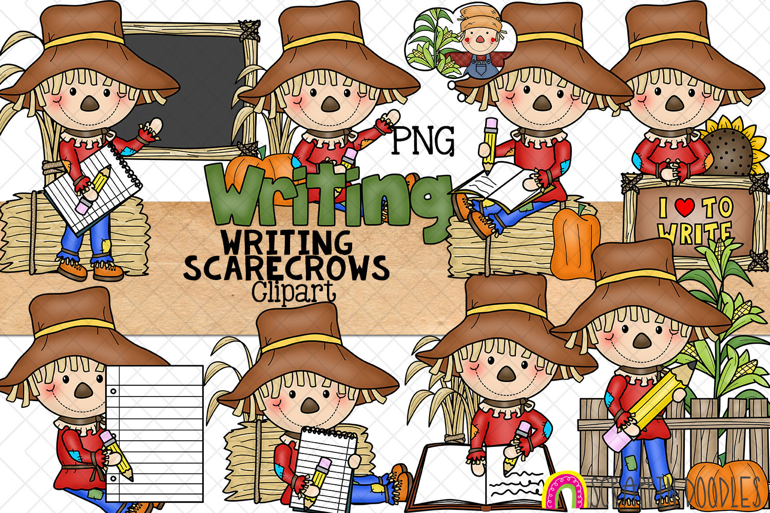 Writing Scarecrows Clip Art - School - Autumn - Fall Farm - Hay Bales - Pumpkins - PNG Sublimation
