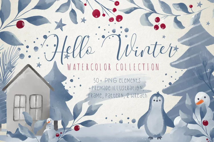 Hello Winter Watercolor Collections, Winter Clipart Bundle