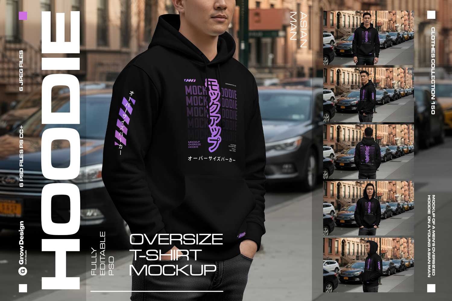 6 Urban Streetwear Hoodie Mockup on Asian Man. Generated AI