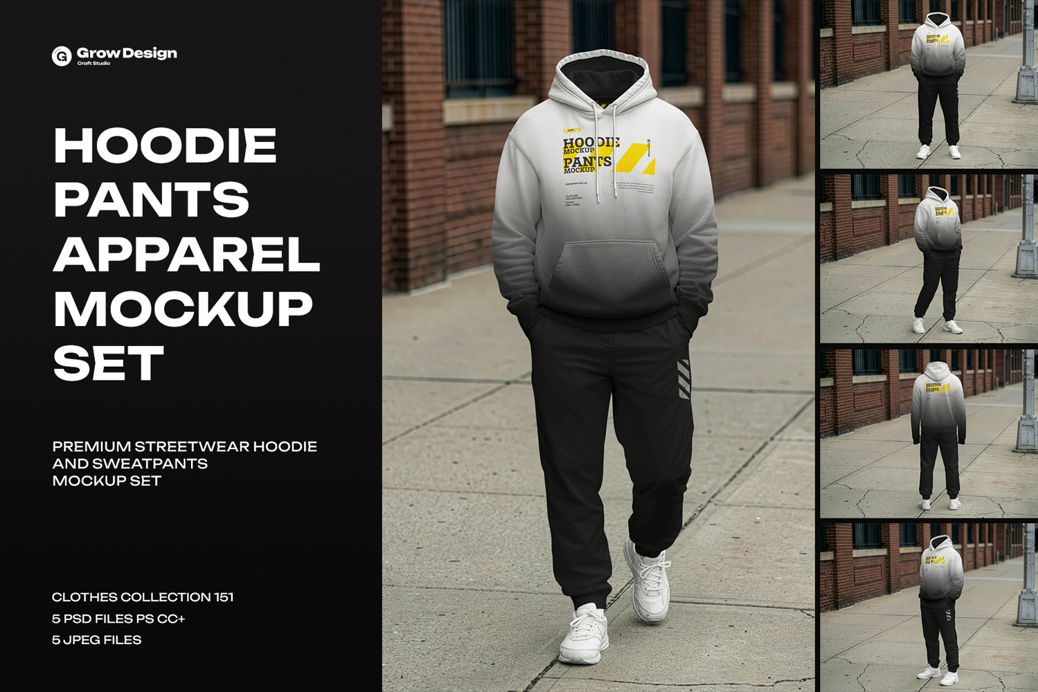 Similar Design Products to 5 Walking Pose Hoodie Pants Apparel Mockup Set. Generated AI