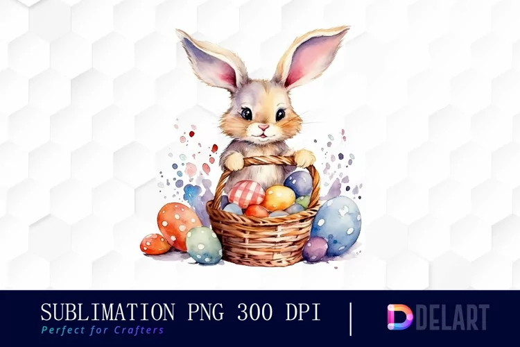 Watercolor Bunny in Easter Basket Sublimation Art example image 1