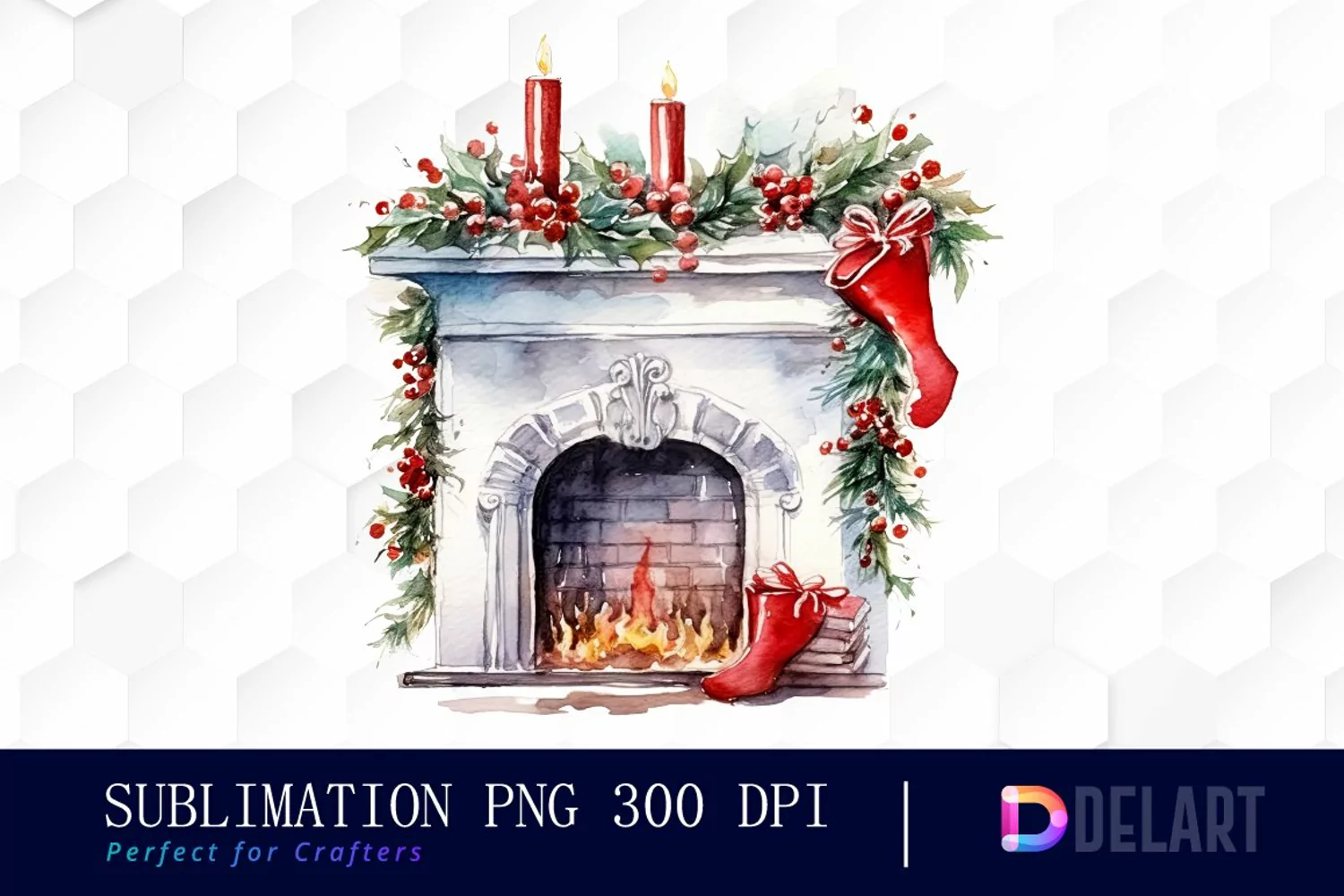 Watercolor Fireplace Decorated Christmas Clipart Image example image 1