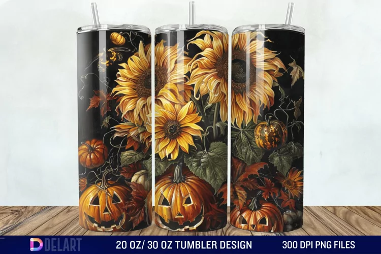 30oz Tumbler Wrap 20oz Tumbler Wrap Fall Season Tumbler Halloween Drinkware Sunflower Pattern Sunflower Decor Pumpkins Tumbler Wrap 3d Halloween Sunflowers Halloween-themed Tumbler Pumpkin Design Tumbler Wrap