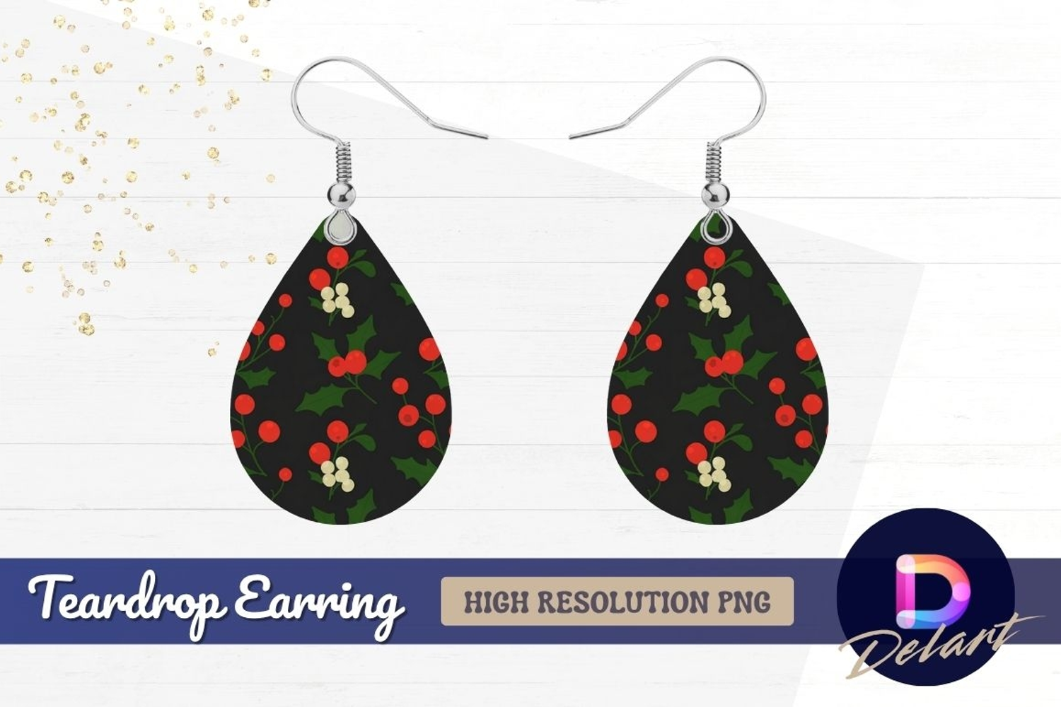 Christmas holly berry pattern on black Teardrop Earring PNG example image 1