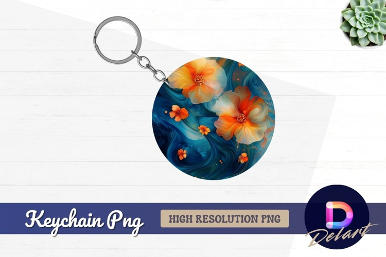Round Design Floral Flowers Abstract Background Orange Blue Circle Keychain