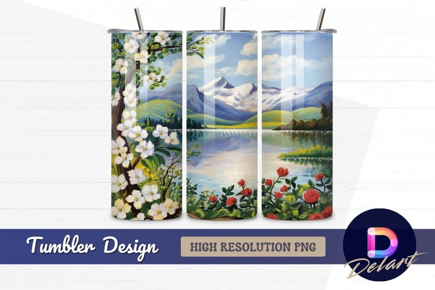 Mountain lake landscape blossoms Tumbler PNG Design example image 1