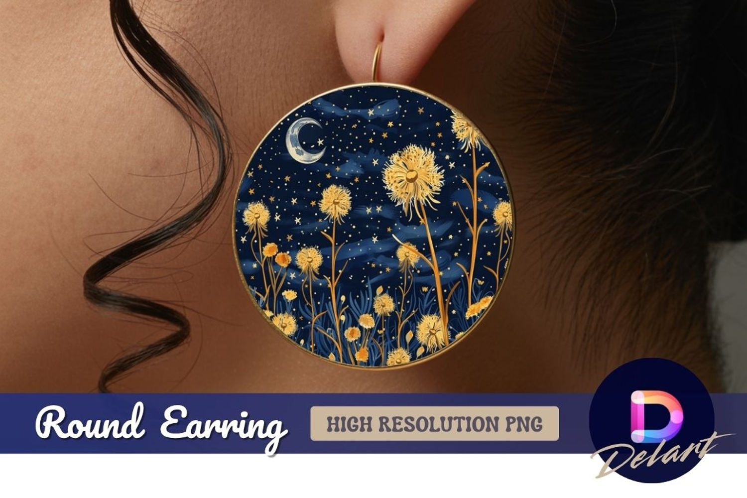 Illustration Design Floral Moon Cosmos Plants Night Stars Starry Dandelions Under Starry Night Round Earring Png Da