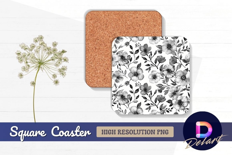 Black and white floral watercolor Square Coaster PNG example image 1