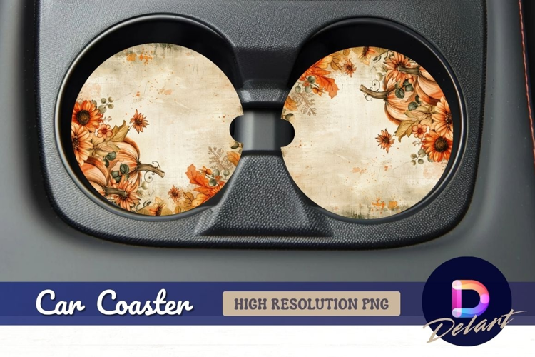 Round Floral Flowers Autumn Fall Harvest Leaves Thanksgiving Pumpkins Car Coaster