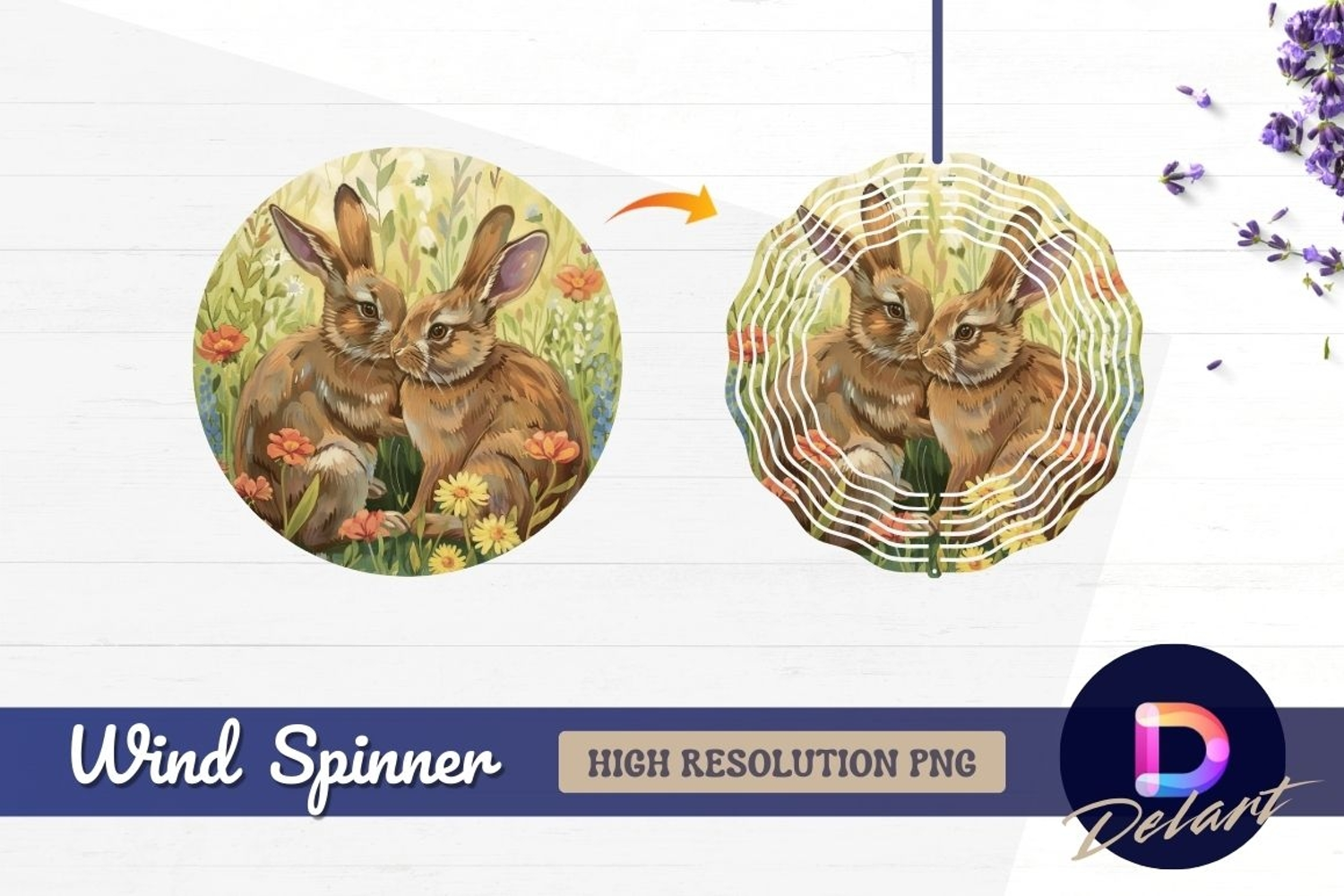 Watercolor rabbits among flowers Round Wind Spinner PNG example image 1