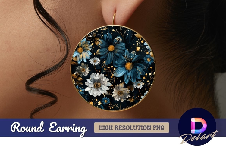 Stylish Elegant Blue Flowers Floral Pattern Circular Dark Background Jewelry Design Earring Design Round Design Gold Accents