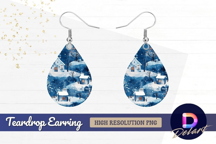 Winter watercolor village pattern Teardrop Earring PNG example image 1