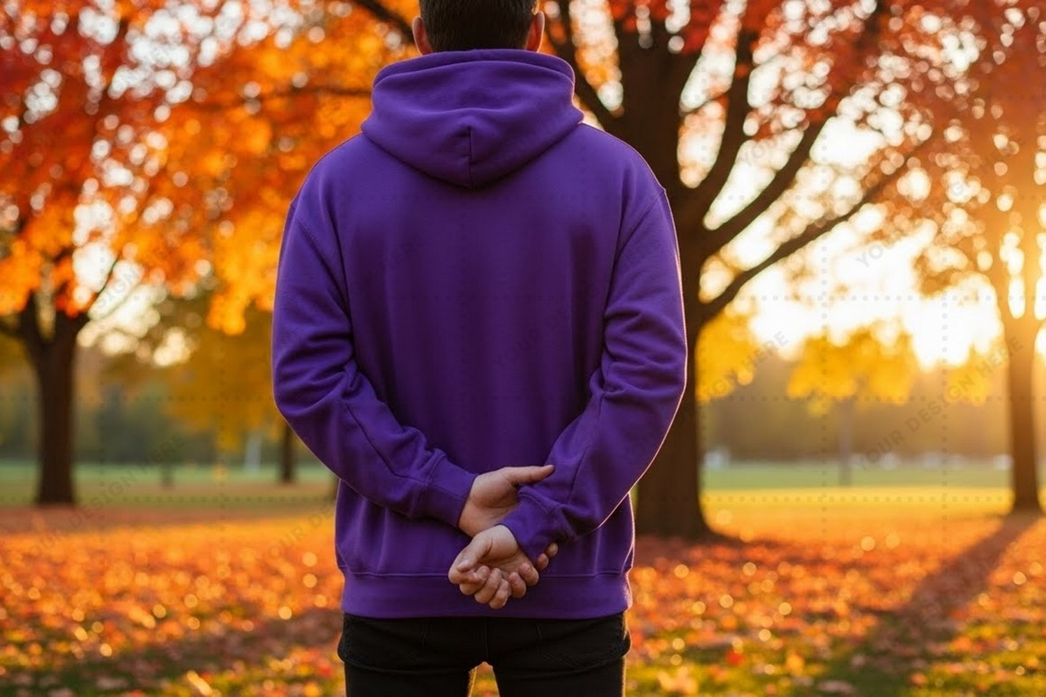 Please Note: A person wearing a stylish purple hoodie stands in an autumn park surrounded by trees with vibrant orange and yellow leaves. The hoodie features a drawstring hood and kangaroo pocket.