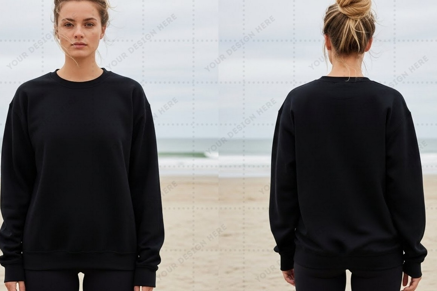 Design T-shirt Clothing Mockup Beach Model Front View Back View Fit Black T-shirt