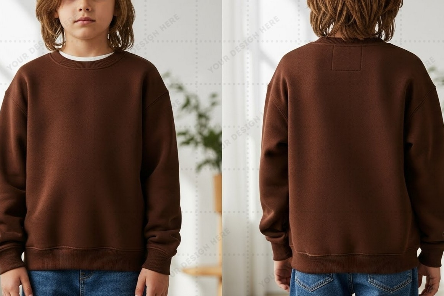 Design Mockup Model Brown Front View Back View Sweatshirt Crew Neck Casual Wear Indoor Setting