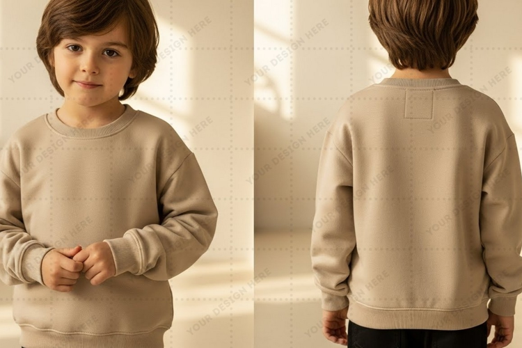 Kids beige crew neck sweatshirt T-shirt Mockup Design