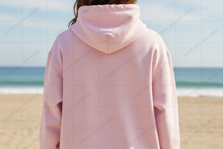 Light pink hooded sweatshirt on beach T-shirt Mockup Design example image 1