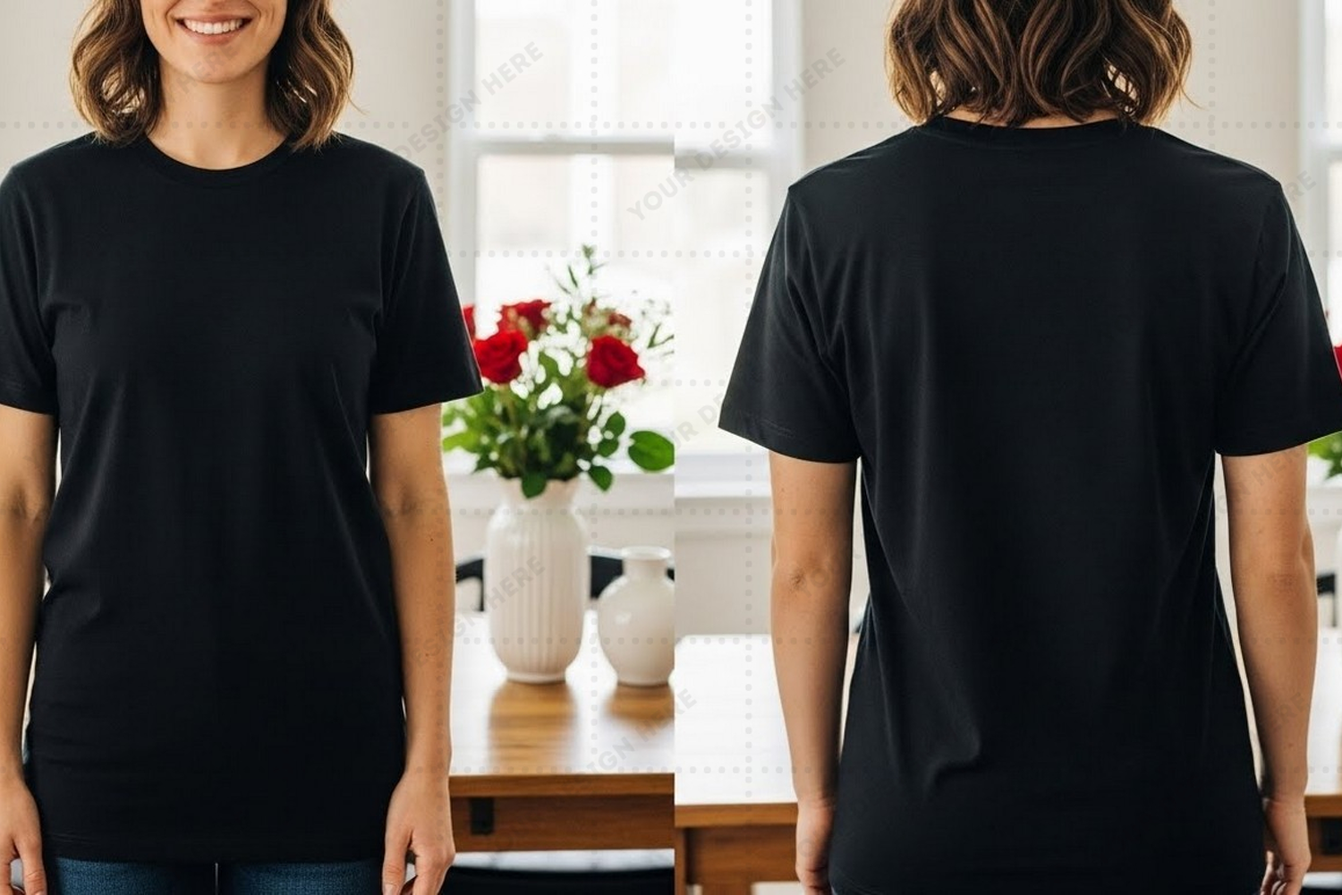 T-shirt Mockup Model Front View Back View Short Sleeves High-quality Crew Neck Black T-shirt Casual Wear
