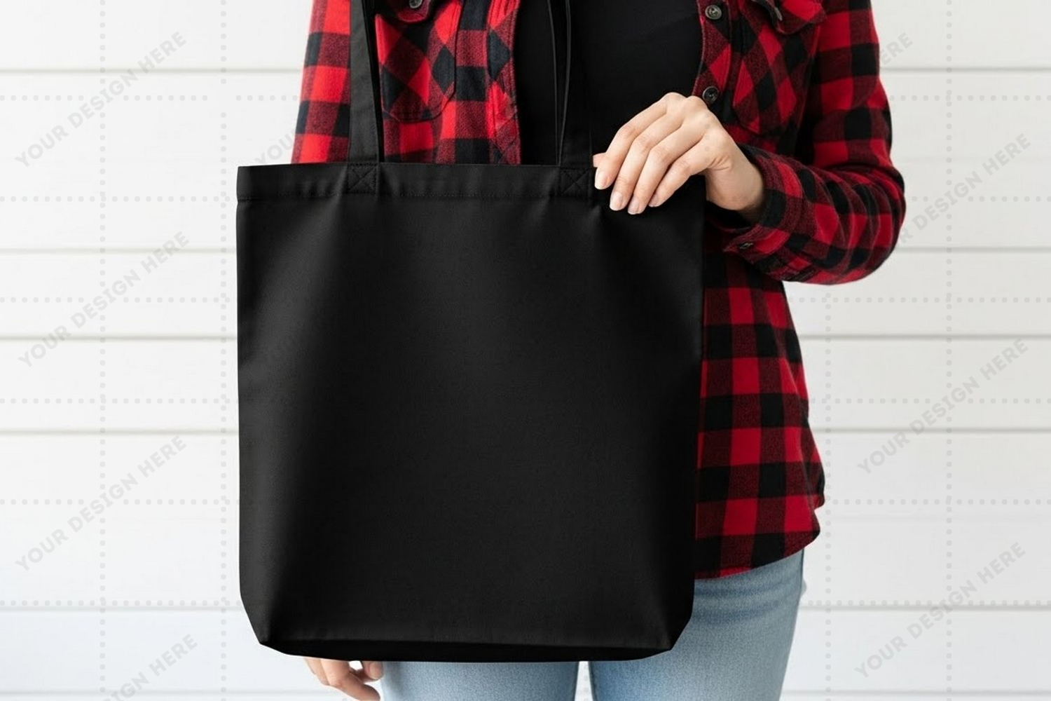 Mockup Shopping Bag Tote Bag Canvas Bag Fashion Accessory Black Bag Blank Bag Plaid Shirt Carrying Bag Promotional Bag