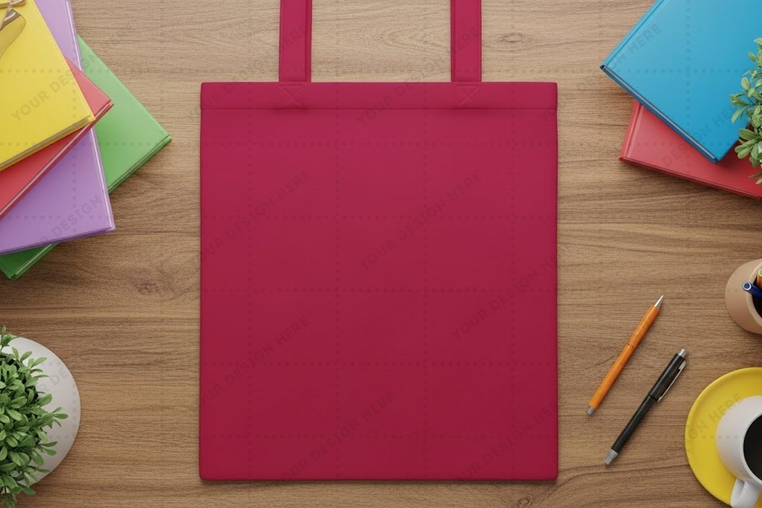 Stationery Branding Pencils Notebooks Mockup Design Tote Bag Potted Plant Wooden Table Design Showcase Red Tote Bag