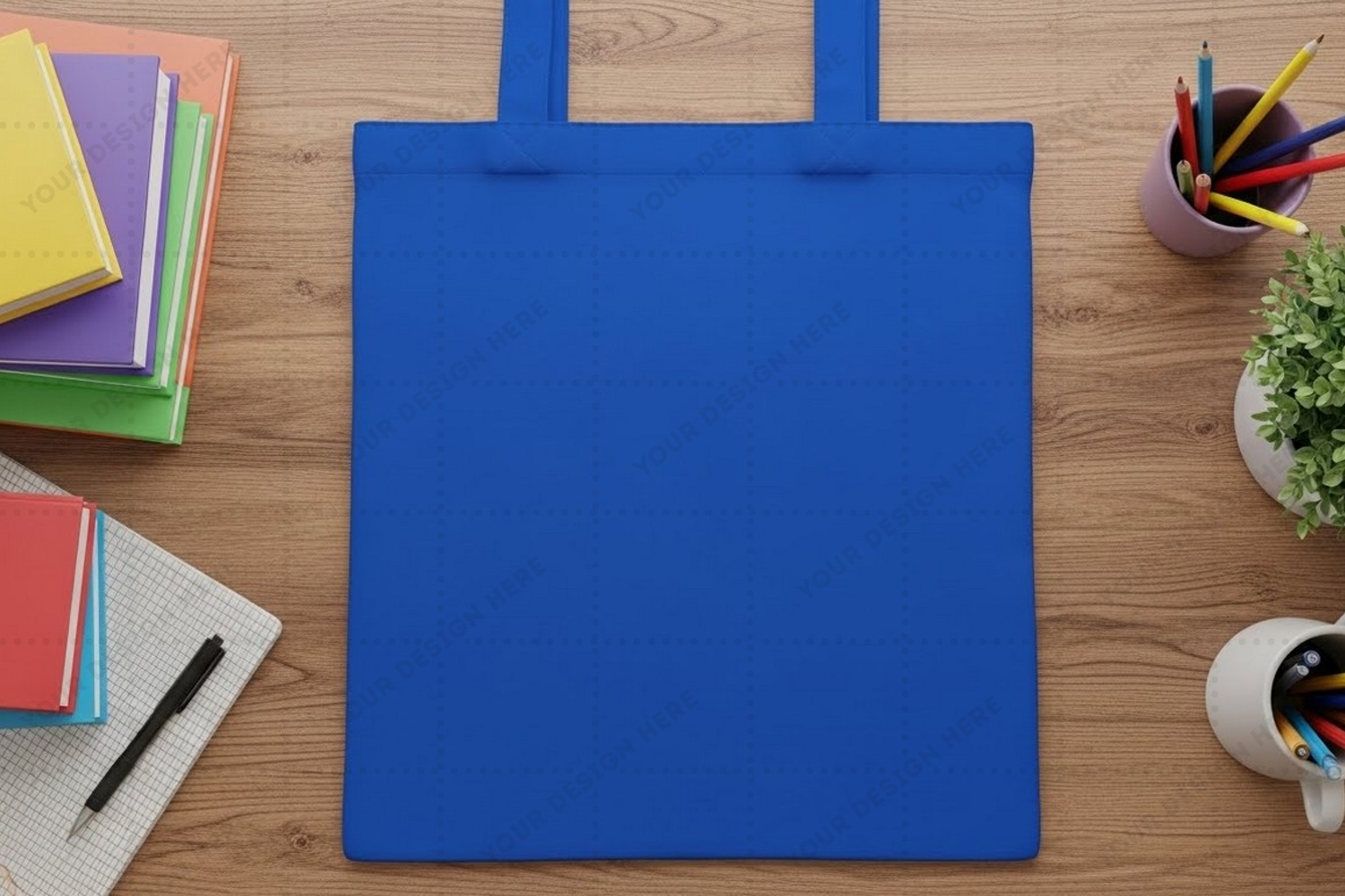 Design Mockup Blue Workspace Pens Notebooks High Quality Tote Bag Potted Plant Wooden Table