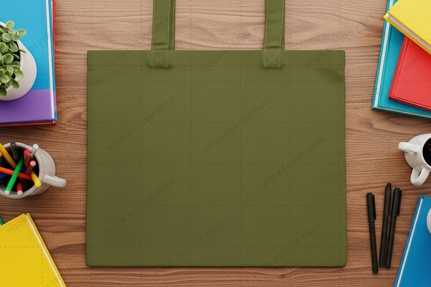 Design Green Mockup Canvas Plant Desk Customizable Tote Bag Office Supplies Wooden Desk