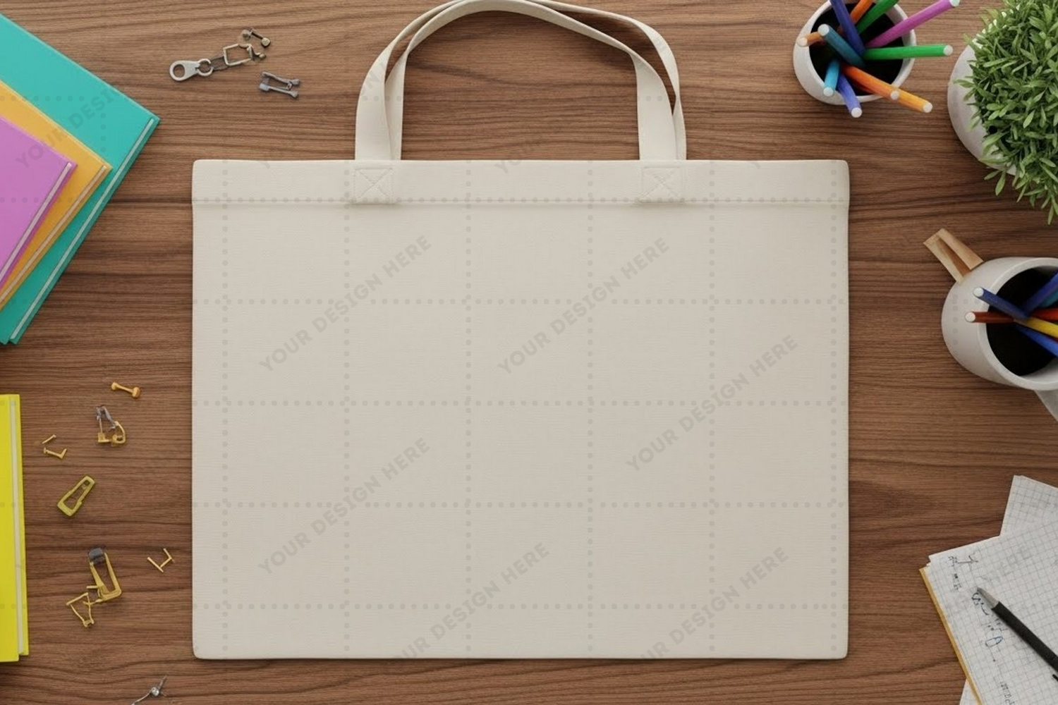 Stationery Design Minimalist Mockup Plant Blank Customizable Tote Bag Office Supplies Wooden Desk