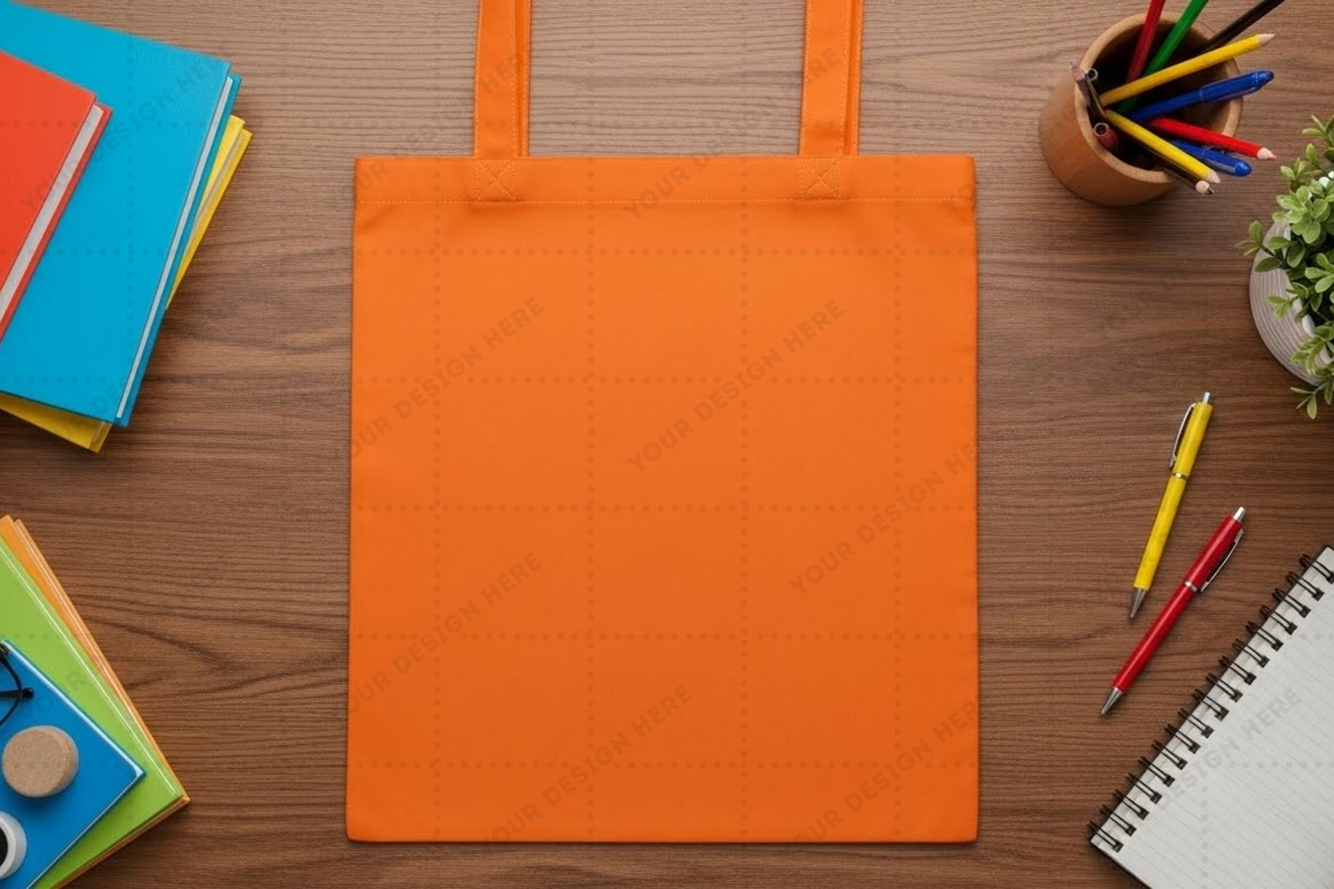 Stationery Branding Colorful Mockup Wooden Orange Desk Notebooks Custom Design Tote Bag