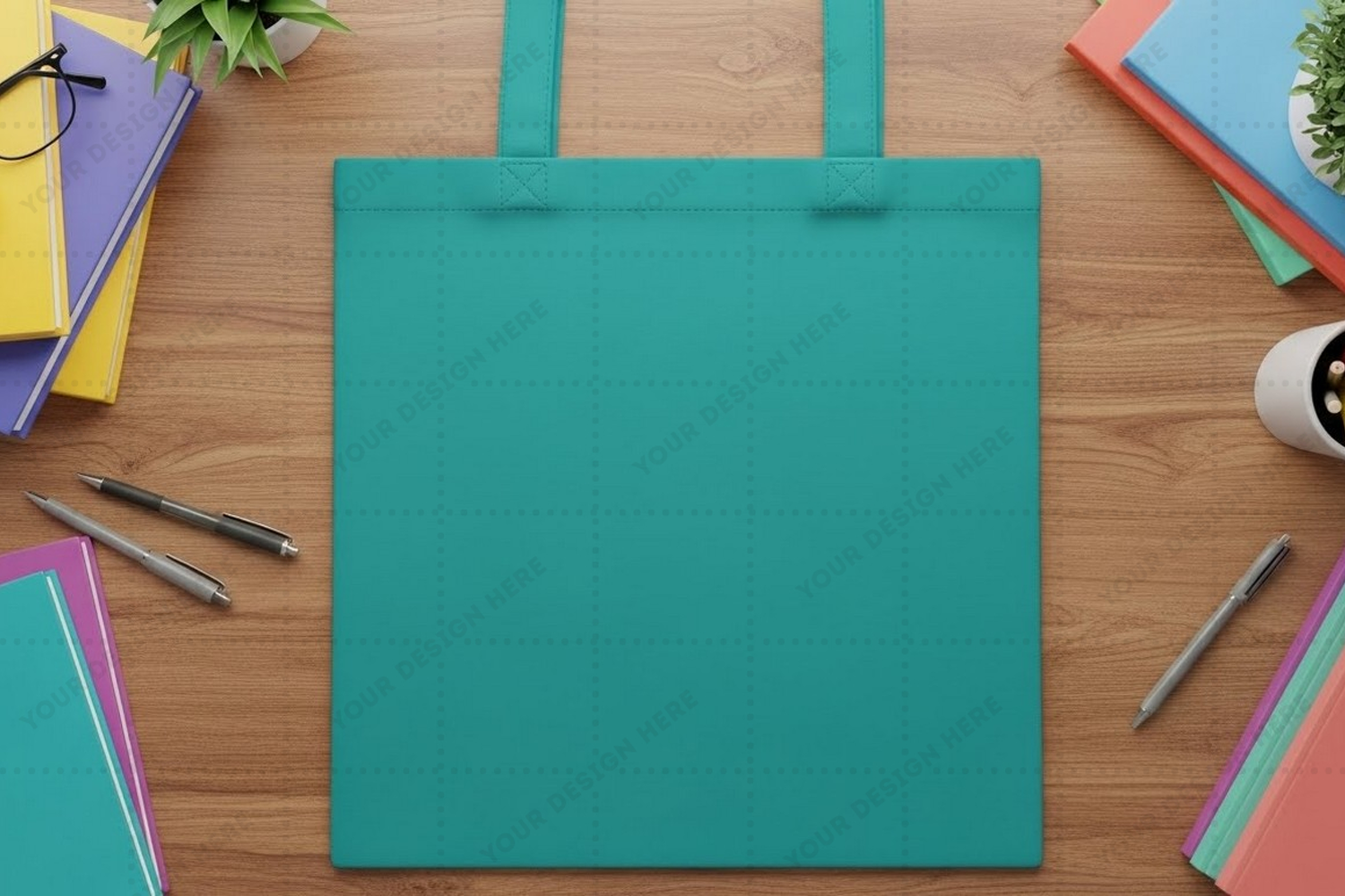 Stationery Branding Design Mockup Bag Teal Custom Design Tote Bag Office Supplies Wooden Table