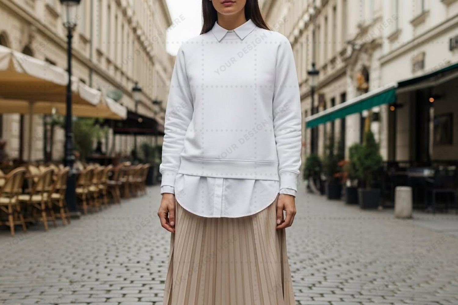 T-shirt Mockup White T-shirt Urban Fashion City Street Stylish Woman Chic Outfit Beige Skirt Pleated Skirt Cobblestone Street