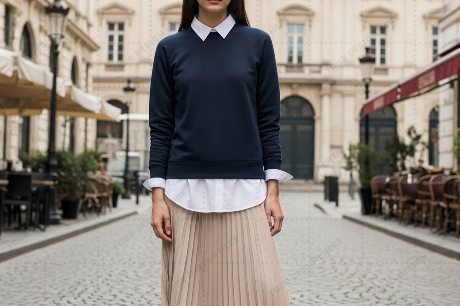 Fashion T-shirt Mockup Navy Blue White Shirt Urban Setting European Street Layered Look Beige Skirt Pleated Skirt