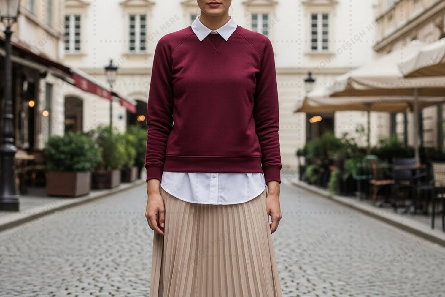 Women's burgundy collared sweatshirt with white shirt mockup