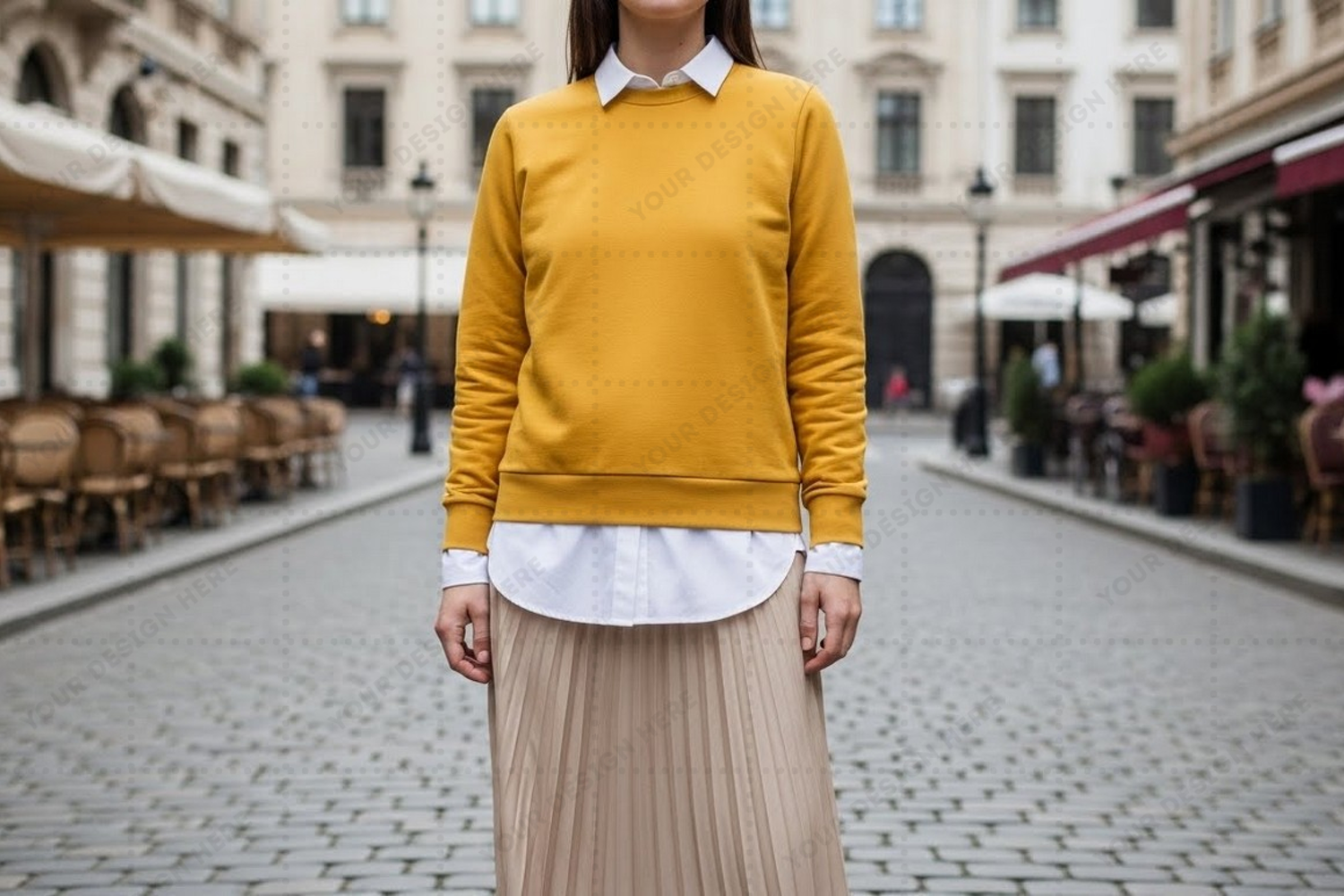 Fashion T-shirt Mockup Mustard Yellow Urban Style White Shirt Layered Design Street Fashion Beige Skirt City Setting