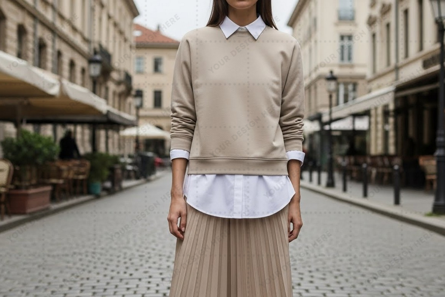 Layered Urban Design T-shirt Mockup Beige Collar White Shirt Long-sleeve Pleated Skirt