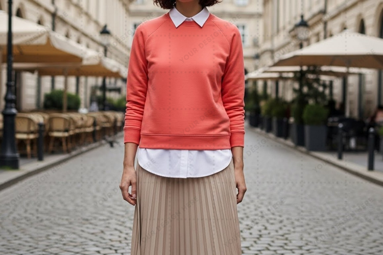 Fashion T-shirt Mockup Coral Street Style Layered Design Urban Setting White Collar Beige Skirt Pleated Skirt
