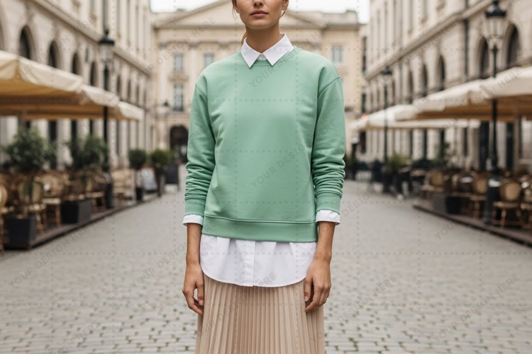 Fashion Design T-shirt Mockup Mint Green Street Style White Shirt Long Sleeves Classic Collar Pleated Skirt
