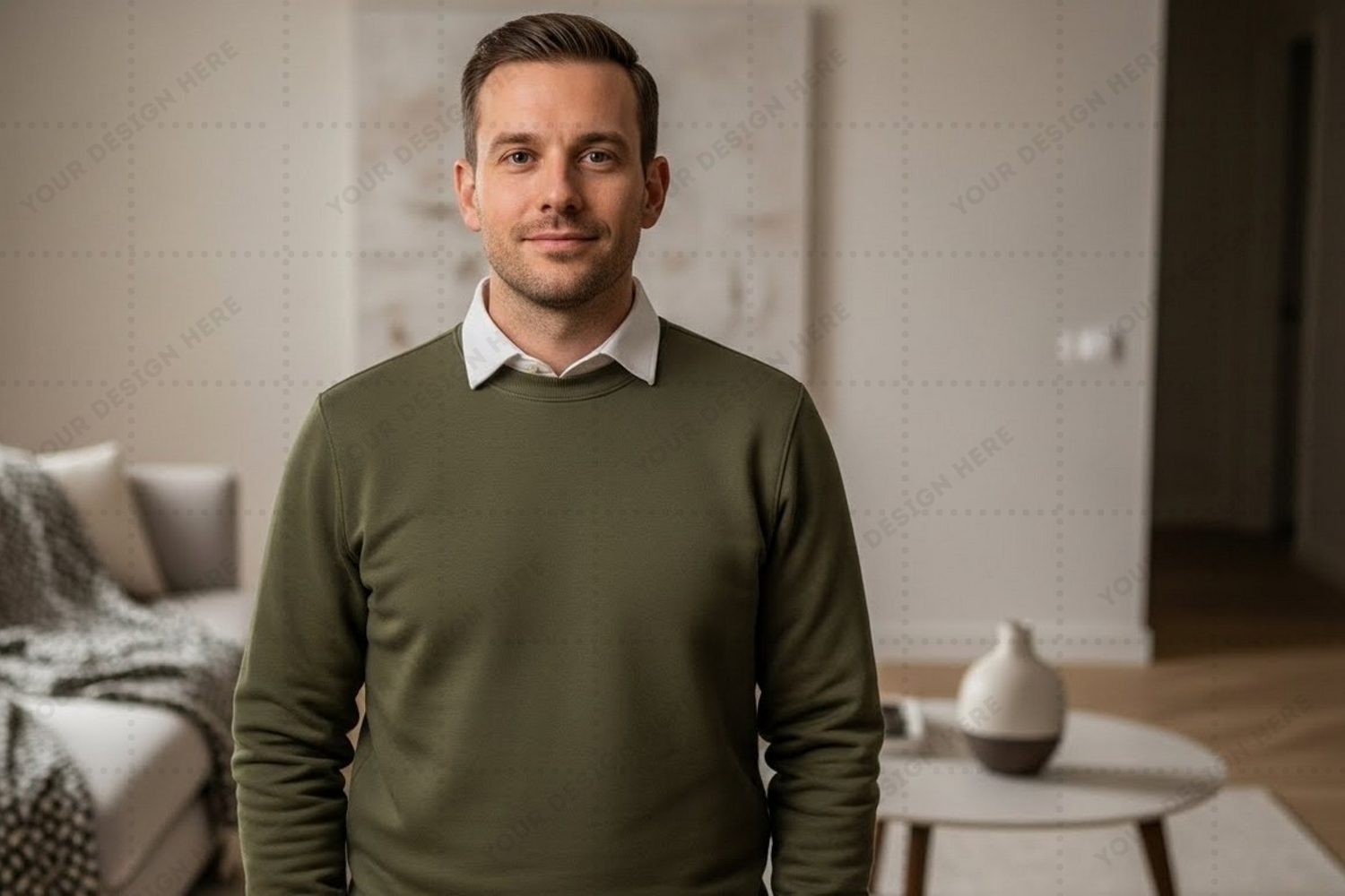 Modern Design T-shirt Mockup Living Room Sofa Minimalist Decor Green T-shirt Side Table Decorative Vase White Collared Shirt
