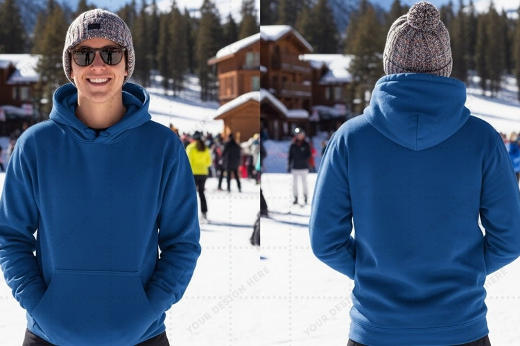 Outdoor Front View Back View Hoodie Mockup Design Hooded Sweatshirt Casual Wear Winter Clothing Blue Hoodie Snowy Setting