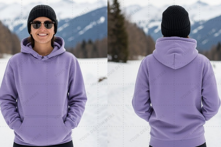 Front View Back View Mockup Design Hooded Sweatshirt Winter Clothing Sweatshirt Design Snowy Landscape Purple Sweatshirt Outdoor Setting Model Wearing