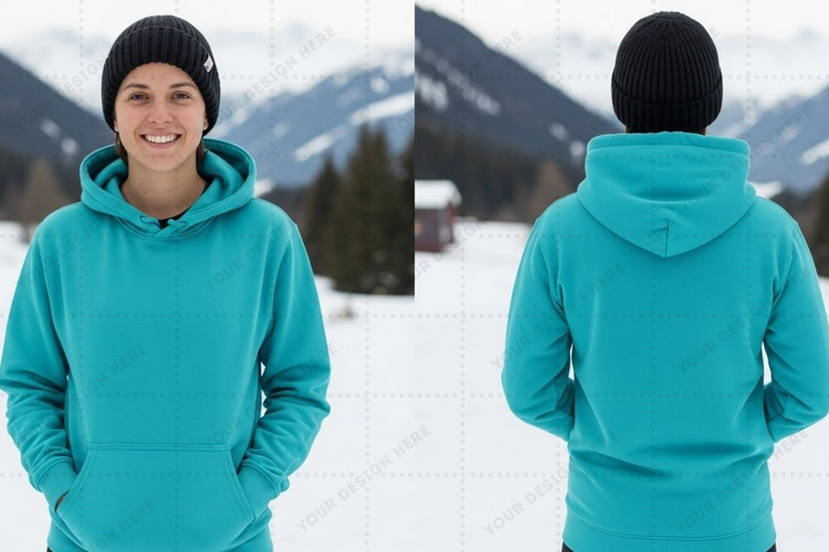 Mockup Design Snowy Mountain Sportswear Hooded Sweatshirt Winter Clothing Outdoor Wear Front Pocket Teal Hoodie Cold Weather Gear Drawstring Hoodie
