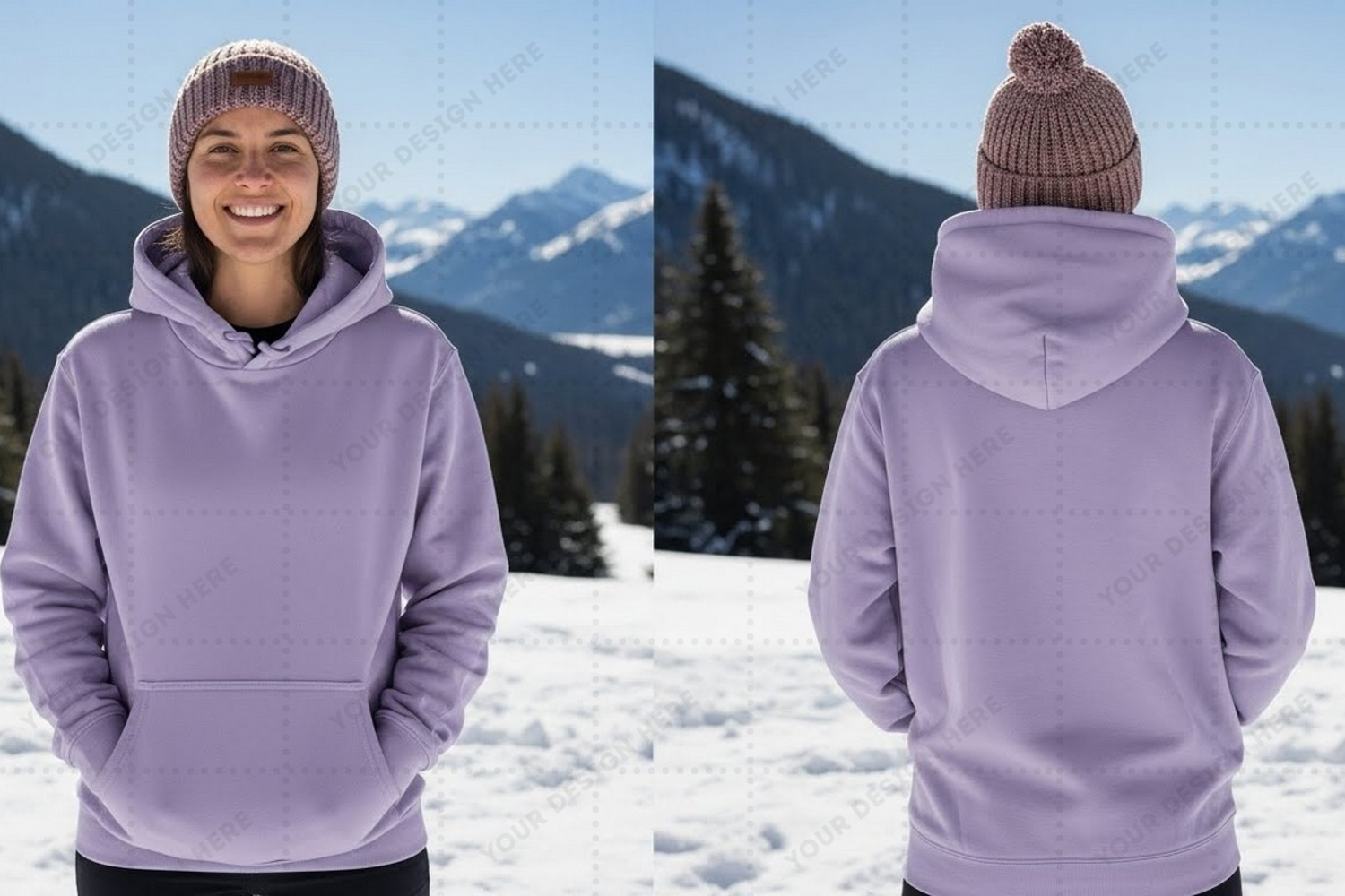 Mockup Winter Outdoor Mountain Lilac Hoodie Hooded Sweatshirt Casual Wear Snowy Landscape Drawstring Hood