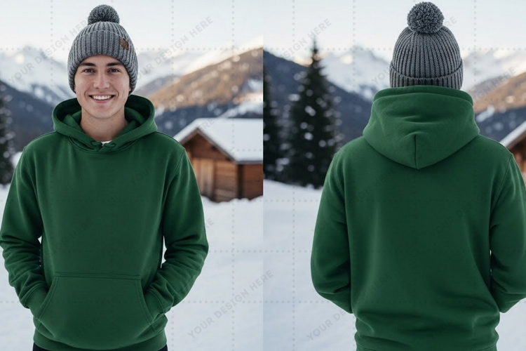 Sports Mockup Winter Outdoor Mountain Front View Back View Hoodie Green Hoodie Snowy Landscape